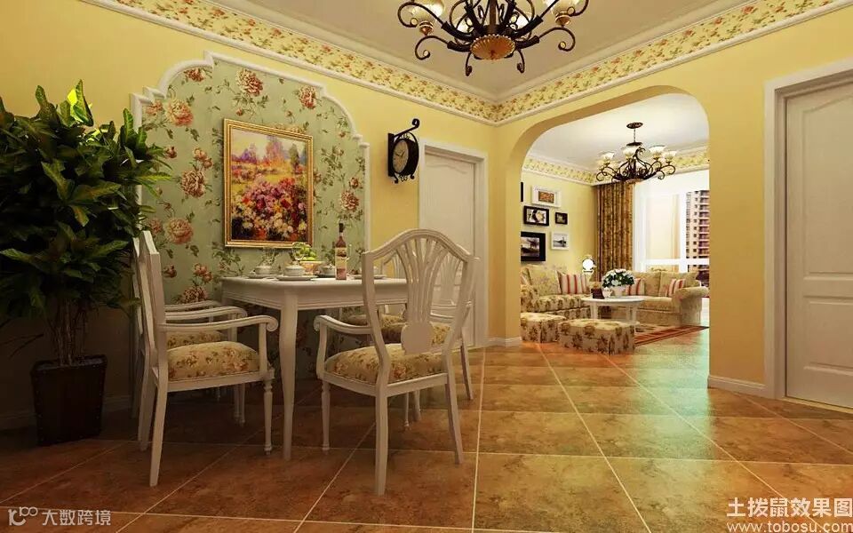 田园风当然少不了花朵的装饰啦,田园风格餐厅背景墙效果图中背景墙多以青春靓丽的色彩搭配花朵装饰,在这样的环境下就餐是不是觉的吃饭的时候还能感受到清风和花香呢。