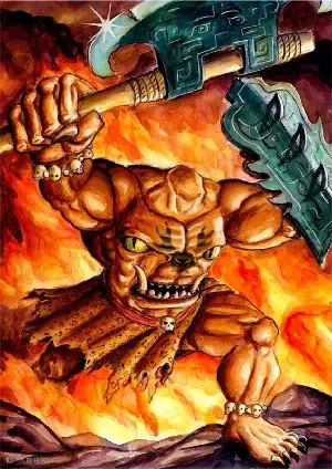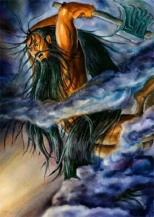 盘古发起怒来,抓起一把与生俱来的大斧,用力一挥,只听得一声巨响,震耳欲聋,大鸡蛋骤然破裂,其中轻而清的东西向上不断飘升,变成了天,另一些重而浊的东西,渐渐下沉,变成了大地。盘古开辟了天地,高兴极了,但他害怕天地重新合拢在一块,就用头顶着天,用脚踏住地,显起神通,一日九变。