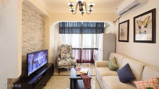 客厅非常的小 电视墙非常的短 但整体空间光线却非常的好 小小的空间里有若温暖的阳光 为了扩大整体空间感觉 阳光的融入 成就了视觉的扩大 文化砖的整体运用,很好的过渡了阳光与背景墙