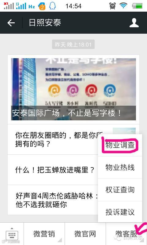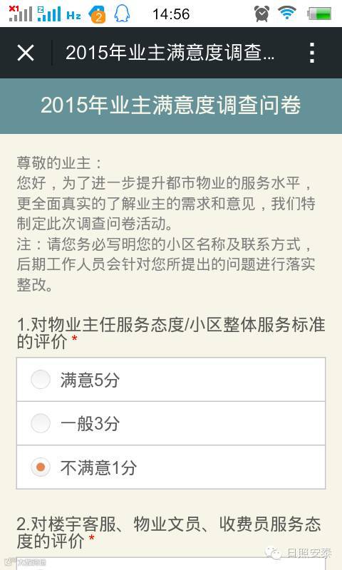 进入【日照安泰】微信官网,点击界面下方的“微客服”,选择“物业调查”,届时会出现2015年业主满意度调查问卷的界面,点击进去选择您认为合适答案的选项,并在空白处填写意见即可。
