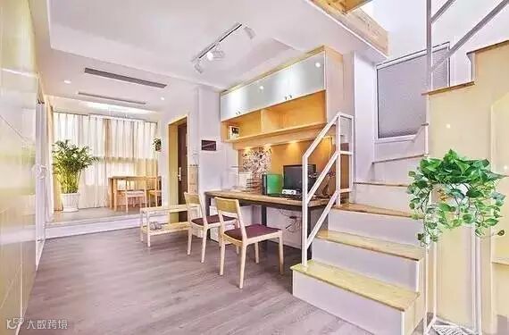 空间设计上大胆打破固定隔断,客厅、卧室、书房改造成开放式,利用客厅飘窗的位置,拓展出榻榻米地台,增设休息区。卧室直对客厅电视墙,私人时间可躺卧观看影片,有客人时拉上折叠门,保护隐私。楼上设为露台花园,花草世界配上小水池,在动植物的陪伴中安抚疲惫的心灵。