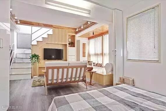 “小户型双人沙发背后,便是开放式卧室,当折叠门打开时,主人可以很方便地在床上观看影片。来客时,折叠门一关,卧室风光自然遮掩不可见了。”