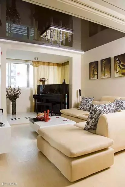 客厅吊顶用了黑玻,也有一定的视觉延伸