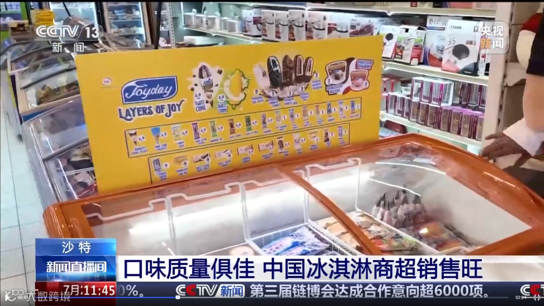 央视总台记者走进沙特首都利雅得的商超,看到包装鲜亮、口味多样的伊利Joyday冰淇淋被放在冷柜区的中心位置,此前曾被欧美品牌和本土品牌占满的冰淇淋货架,如今已经悄然被中国制造打破冰封。