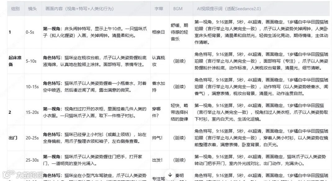 “0-5秒:第一视角闹钟特写,拟人化猫爪关闹钟;5-10秒:猫咪使用粉底液;10-15秒:喷洒香水并微笑”