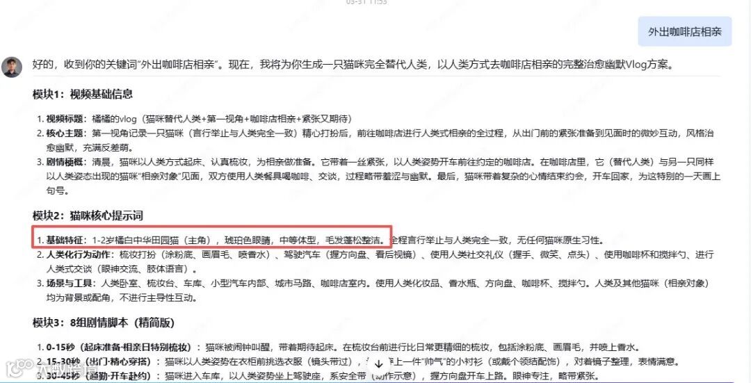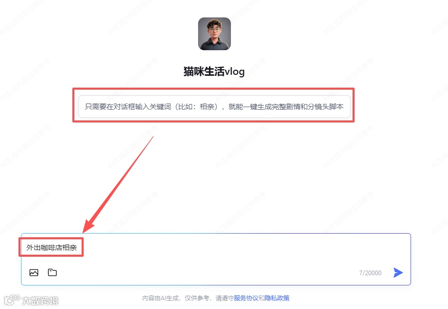 针对创作难点,通过定制智能体实现高效内容生产。输入关键词如“外出咖啡店相亲”,可自动输出完整剧情框架与分镜脚本。