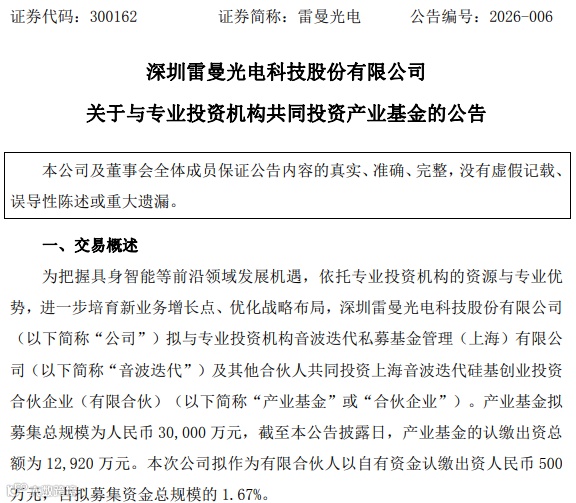 3月31日,雷曼光电公告拟出资500万元参与设立上海音波迭代硅基创业投资合伙企业,该基金总规模3亿元,主要投资于具身智能产业链早期及成长期企业。此次投资旨在把握前沿技术机遇,培育新业务增长点,优化战略布局。