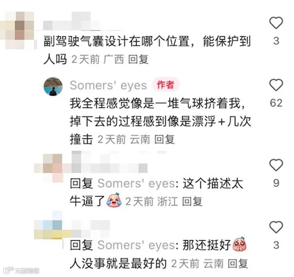事故现场可见,车身外观严重损毁,但乘员舱保持完整,电池无起火,气囊正常弹出。车主描述:"全程冲击力较小,如同被气球包裹",包括两名乘员和一只小狗全部生还。