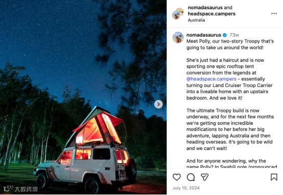 四口之家践行“在路上生活”,倡导环保理念与家庭共探世界。内容契合可持续发展导向的品牌传播需求。
