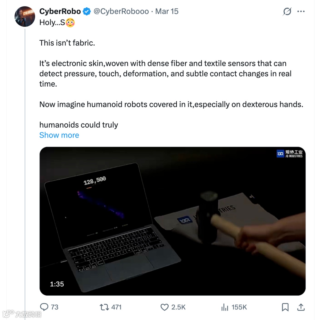 研发该电子皮肤的中国企业——矩侨工业于2025年在B站发布《做了一件有触觉的衣服》等视频,展示机器人电子皮肤应用。