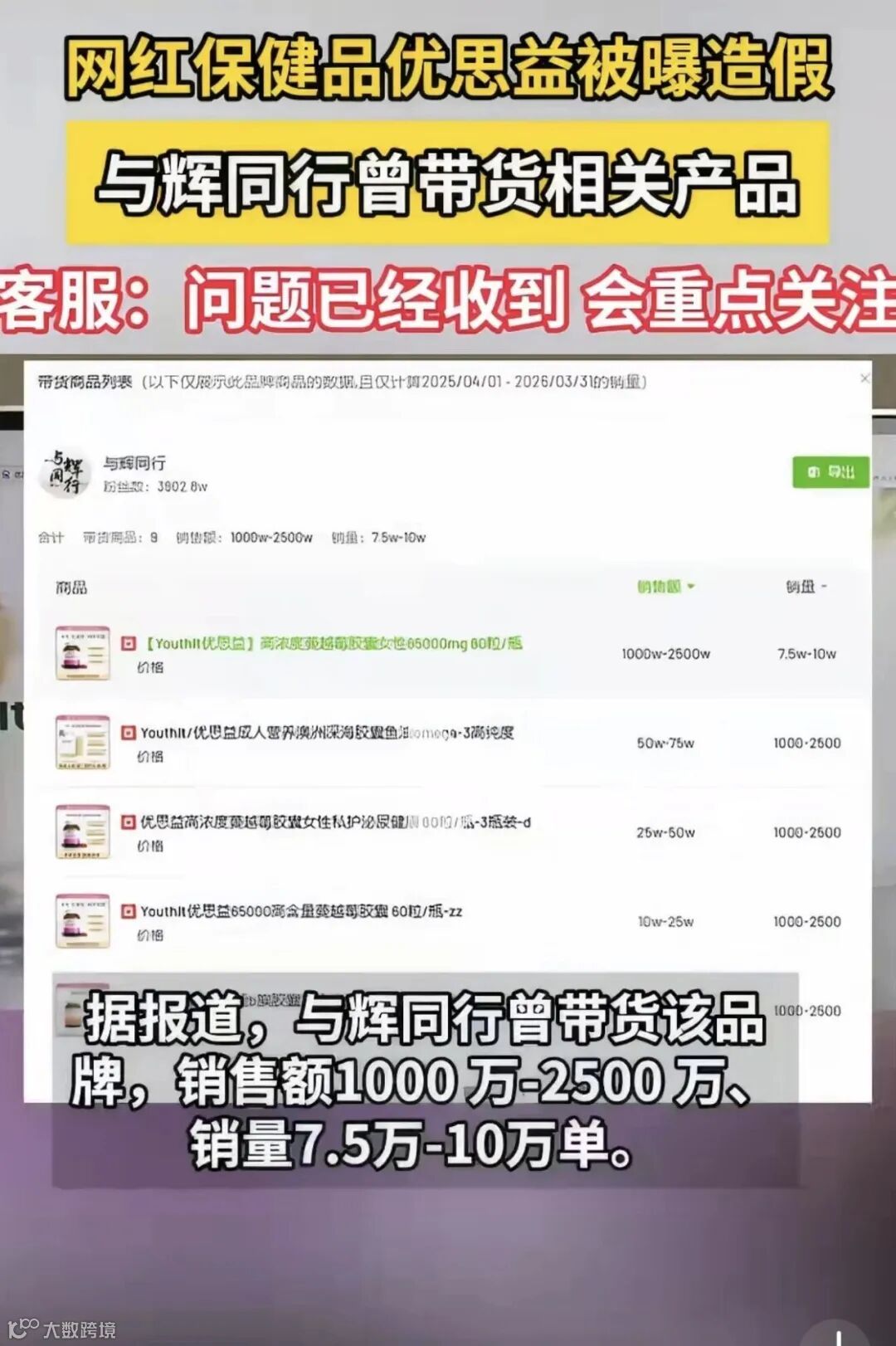 央视曝光优思益所谓"澳洲原装进口"保健品注册地址实为汽车维修站,涉嫌原产地造假。随着舆论发酵,"与辉同行"被曝曾带货该品牌,销售额达1000万-2500万元。