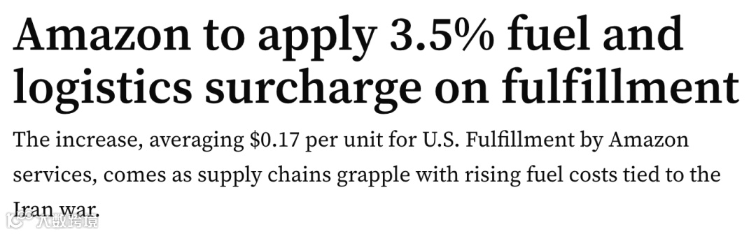 亚马逊此举使其加入了近期因伊朗战争导致成本上涨而调价的物流商名单。目前,UPS和联邦快递的燃油附加费持续攀升,而美国邮政(USPS)也计划于4月26日实施8%的临时涨价。