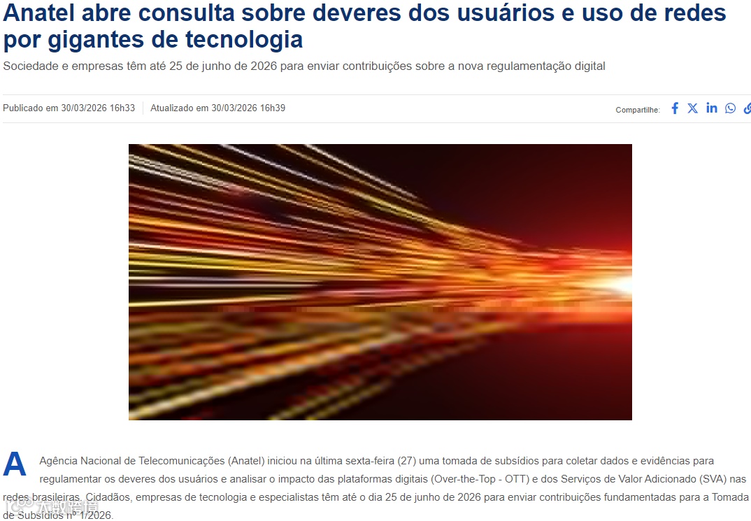 日前,巴西电信监管机构ANATEL启动了一项公众意见征集,希望了解大型数字平台对本地网络运行和用户权益的实际影响。此次征集重点关注两方面:一是这些平台产生的海量数据是否增加了电信网络负担、影响建设投入与服务质量;二是用户在使用过程中是否面临收费不透明、界面诱导消费等不公平设计问题,公众可于2026年6月25日前提交反馈。