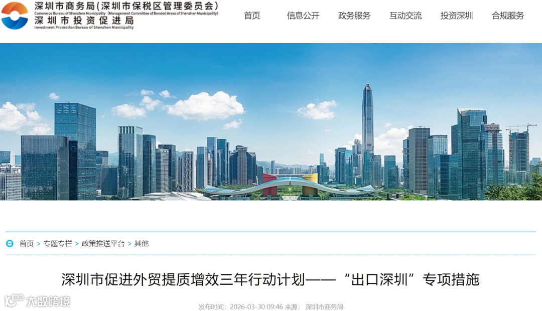 3月30日,深圳市商务局官网发布《深圳市促进外贸提质增效三年行动计划——“出口深圳”专项措施》,聚焦十大重点领域(简称“进口十条”),推动进出口更均衡、更高质量发展。新举措重点支持引进先进设备和关键零部件,加快打造国际消费品集散中心,大力发展跨境电商等新型贸易业态;同步加强外贸平台建设、拓展“一带一路”等多元海外市场、推动绿色低碳转型,并持续优化通关、物流、金融等贸易便利化服务,目标是让进口更好服务产业升级和居民消费升级,全面提升深圳外贸综合竞争力。