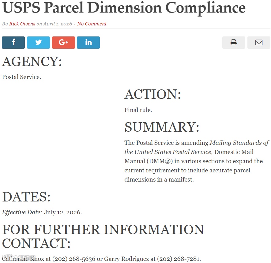 日前,美国邮政局(USPS)决定推迟实施包裹尺寸新规,原定全面收取的“尺寸不符附加费”将延至2027年执行。新规分两步走:第一步,从2026年7月12日开始,所有商业包裹必须如实申报长宽高,但小包裹暂不收费;第二步,预计2027年初启动,届时将根据实际运行数据优化规则,在保障投递效率的同时减轻商家负担。
