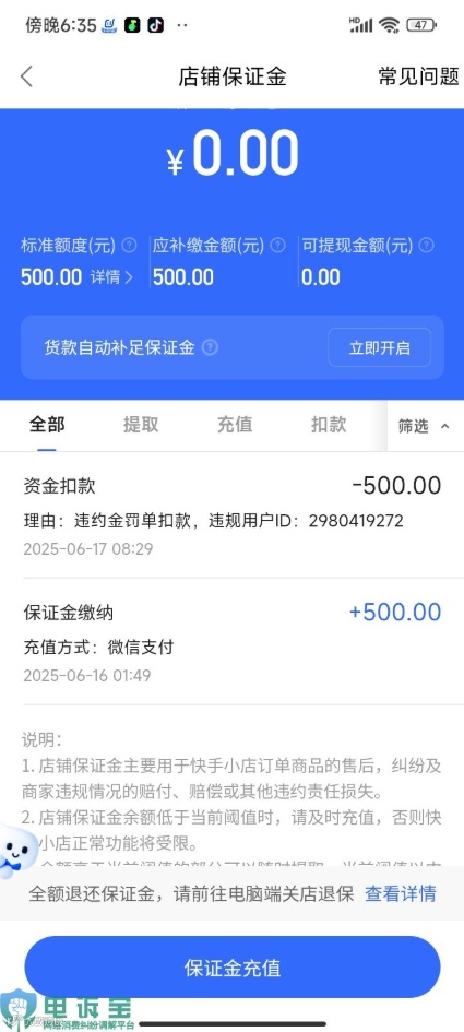 然而,在未售出任何商品的情况下,平台以“违约金罚款”为由直接扣除了全部保证金。客服未能提供具体违规原因,仅以“账号关联”为由拒绝申诉。
