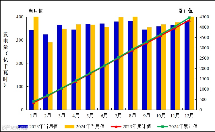 图2:2023年1月至2024年12月全国运行核电机组发电量趋势