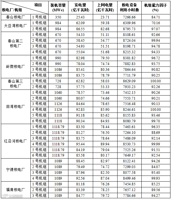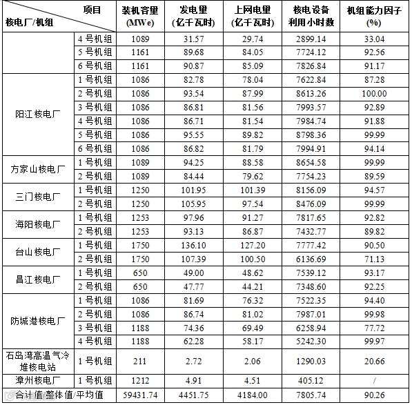 3)本表“合计值/整体值/平均值”中,装机容量、发电量、上网电量为各机组合计值,核电设备利用小时数为全部机组整体值,机组能力因子为全部参与统计机组的算数平均值。