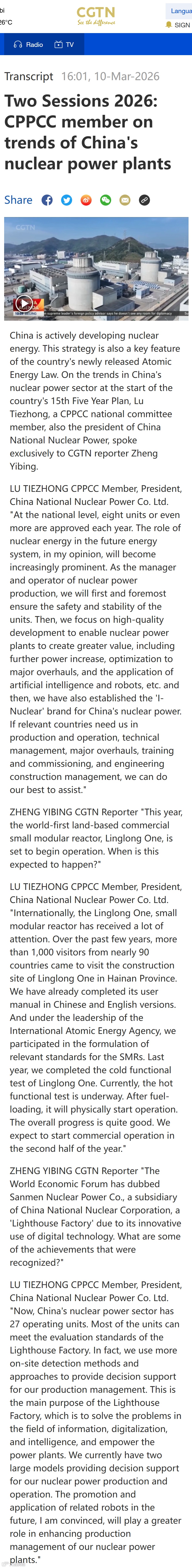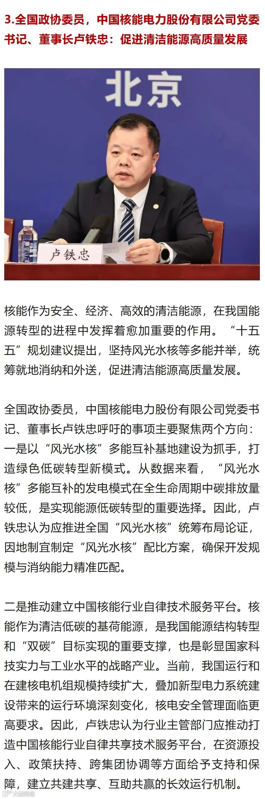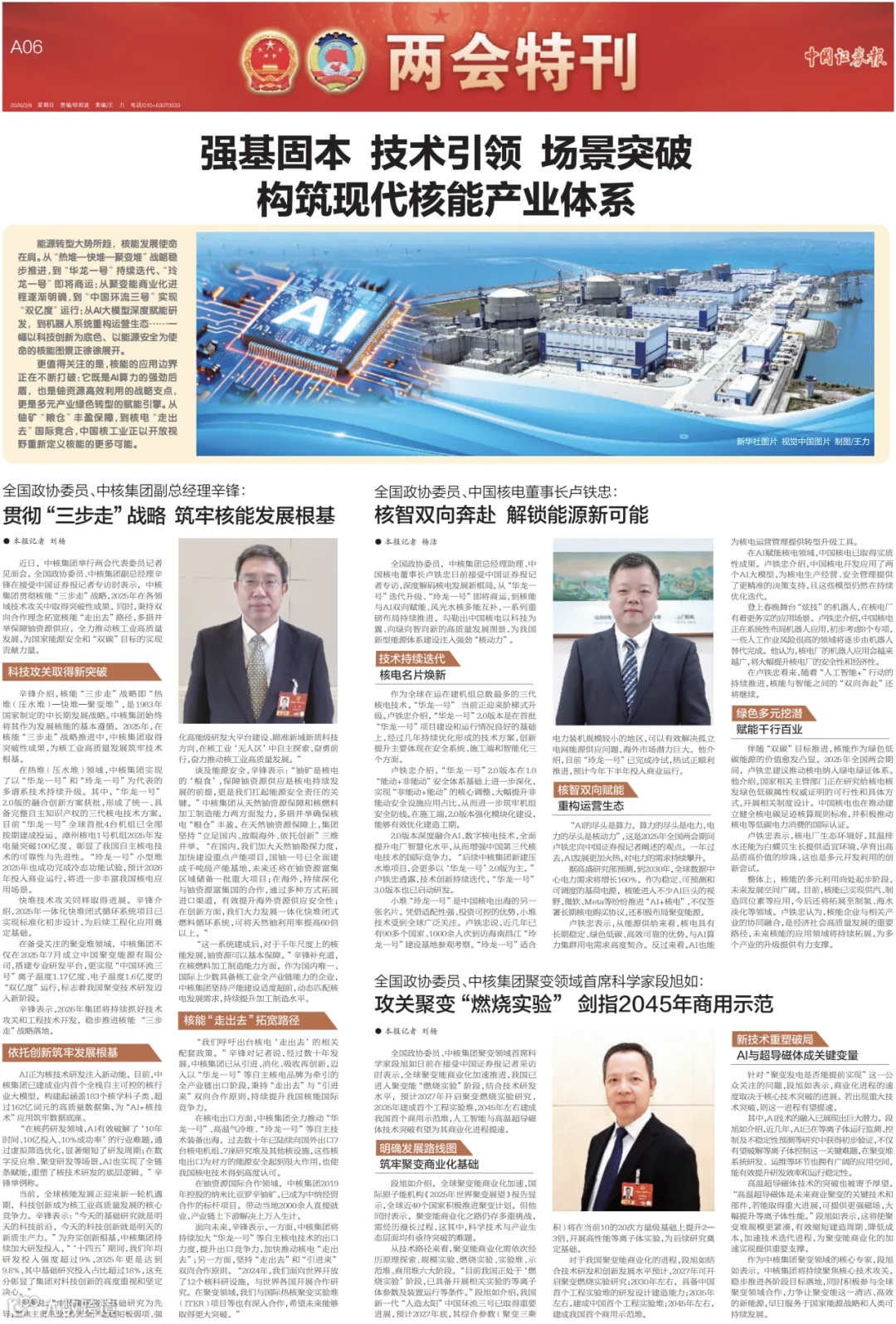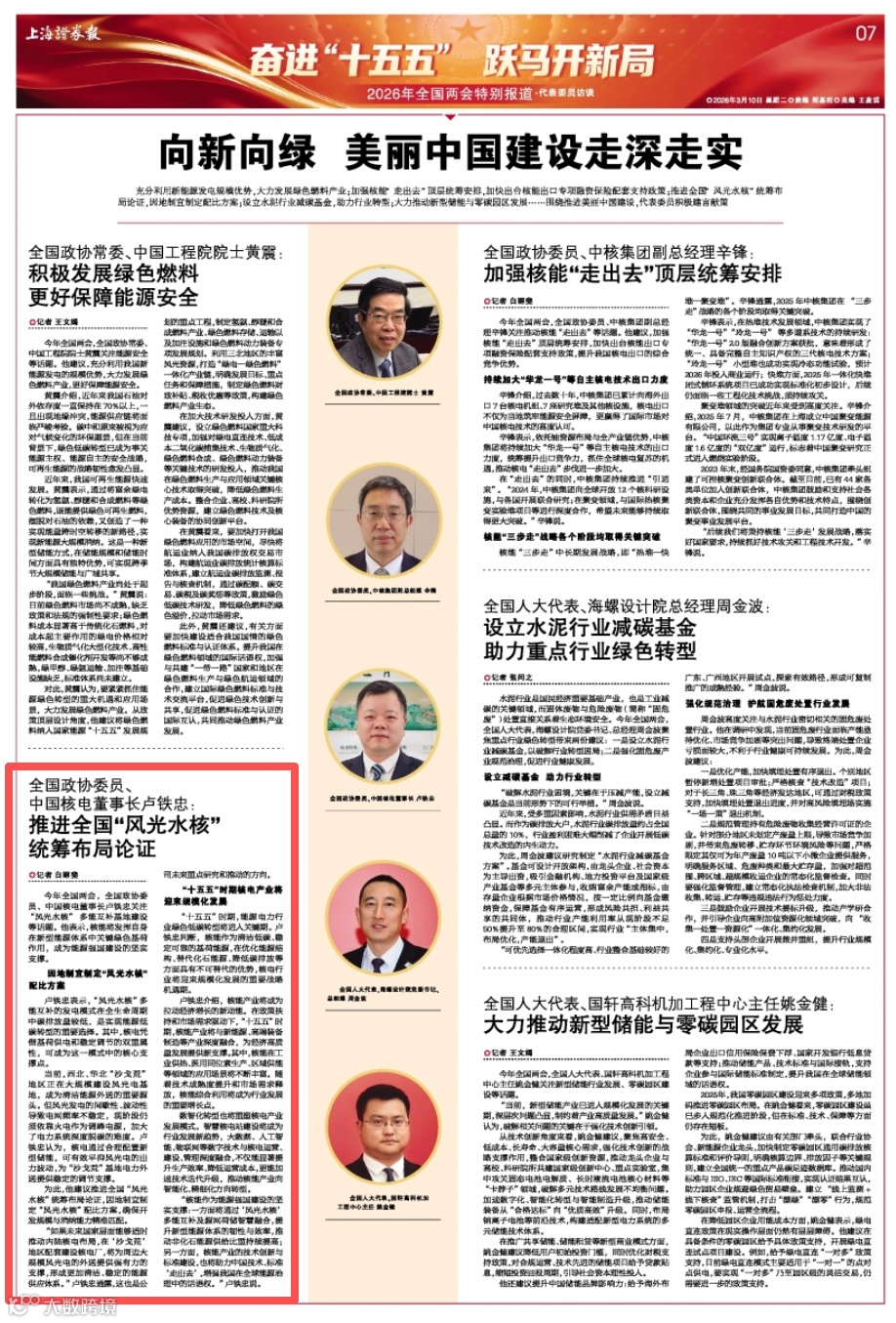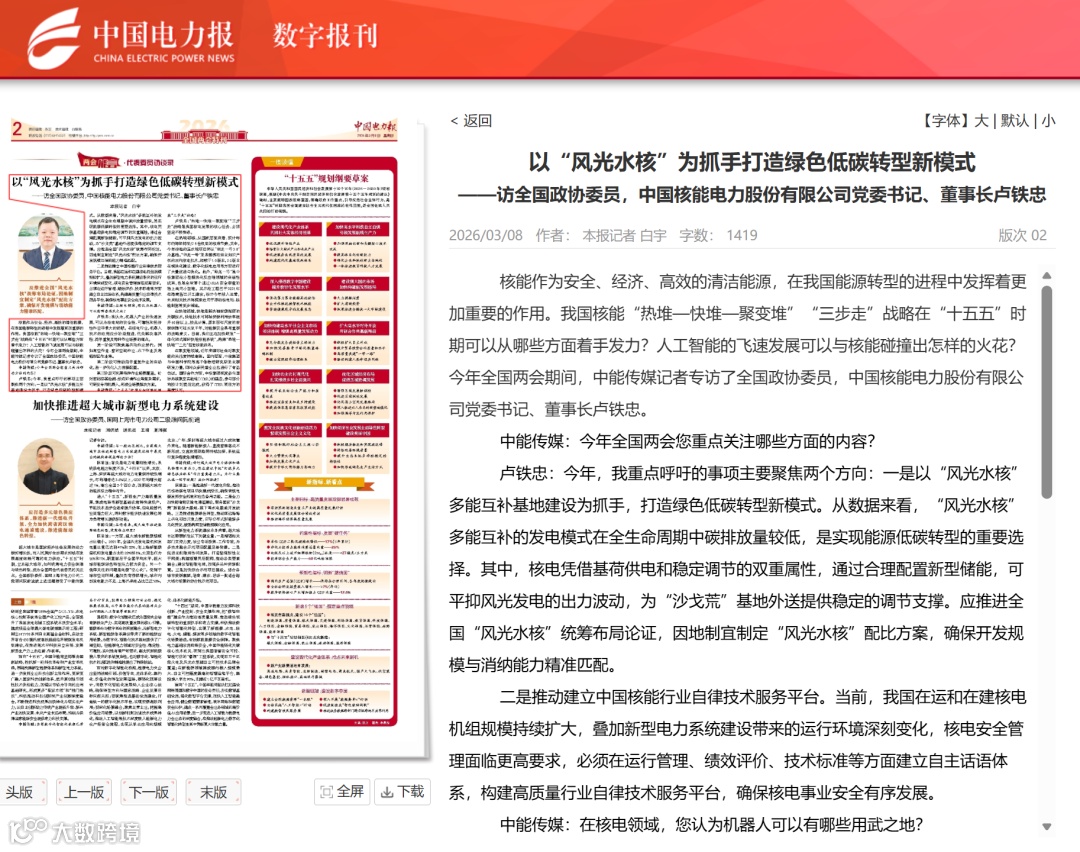 全国政协委员,中核集团总经理助理、中国核电董事长卢铁忠日前接受中国证券报记者专访,深度解码核电发展新棋局。从“华龙一号”迭代升级、“玲龙一号”即将商运,到核能与AI双向赋能、风光水核多能互补,一系列重磅布局持续推进,勾勒出中国核电以科技为翼、向绿向智向新的高质量发展图景,为我国新型能源体系建设注入强劲“核动力”。