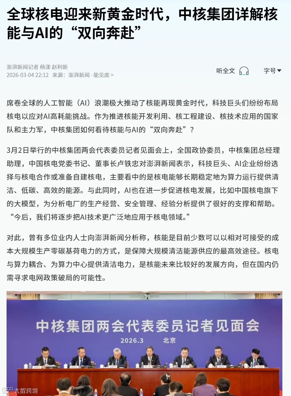“AI的尽头是算力,算力的尽头是电力,电力的尽头是核动力”,这是2025年全国两会期间卢铁忠向中国证券报记者阐述的观点。一年过去,AI发展更加火热,对电力的需求持续攀升。
