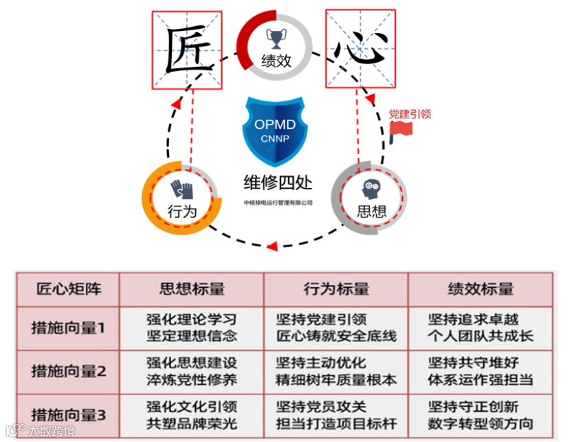 秦山核电维修四处长期致力于部门核安全文化建设,通过“三个强化、六个坚持”系列举措,实现党建工作与核安全文化建设的有机融合。处室积极落实中核集团核安全文化“863”动作要领,致力于构建以党建为引领、以核安全文化为基础的维修安全体系,创建了“思想、行为、绩效”党建模型,倡导并践行“思想引领行为、行为创造绩效、绩效提升思想”的良性循环。基于公司“责任、安全、创新、协同”的核心价值观,部门凝练出“匠心、担当、卓越、成长”为核心的价值追求和“三个强化、六个坚持”匠心矩阵具体举措,将核安全文化建设原则和要素有效融入其中,有力推动核安全文化在组织与员工层面的落地。