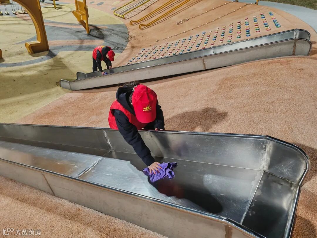 维修二处团总支部赵鑫媛、刘安城、袁豪杰、茅珂培等在海盐县观海园内开展公共环境与儿童游乐设施清洁。