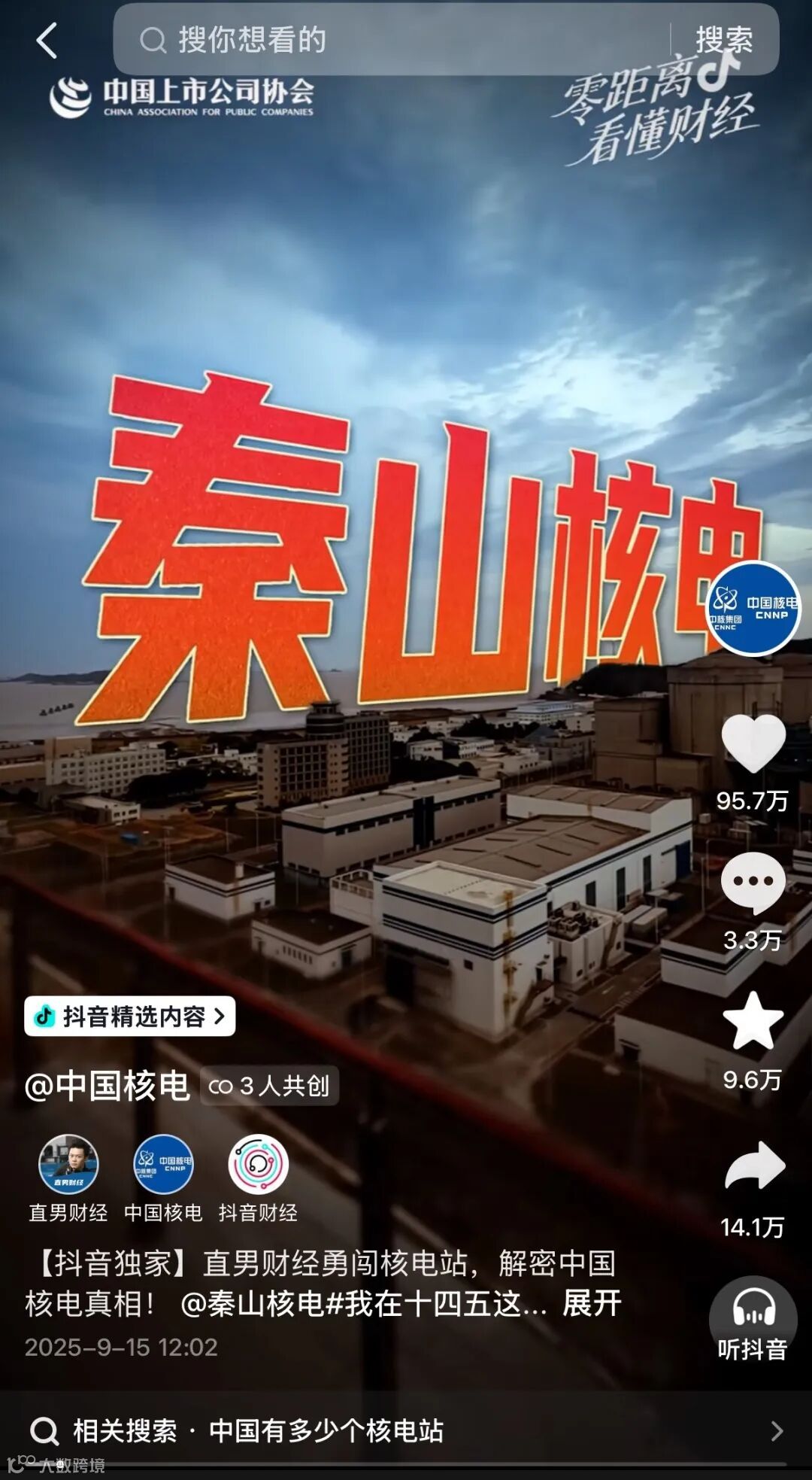 作为中国核电的“红色根脉”和“红船”,秦山核电见证了我国核电从无到有、从小到大、从弱到强的历史跨越,更彰显着“十四五”期间中国核电在科技创新与绿色发展方面的成长与突破。活动邀请了@直男财经、@商业小纸条real、@小狮子 | 财经评论、@小智侃财经、@财经小八等知名博主走进秦山核电,实地参观了核电科技馆、何少华工作室、核能供热首站等,并与核电专家、一线技术人员面对面交流,详解核电安全运行的各种细节。其中,抖音大V“直男财经”还与核电工程师一起,深入探访秦三厂核岛内部,实地了解核电运行情况,感受核电工作者的日常,带给粉丝不一样的探访体验。节目播出后,点击量迅速突破千万,最后接近三千万,点赞量近百万,达到良好的科普传播效果。