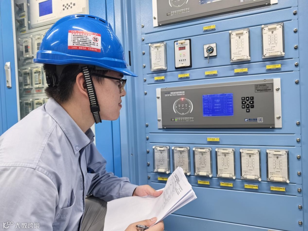 维修四处何逸伦、赵禹等在检查发电机同期试验调试数据。