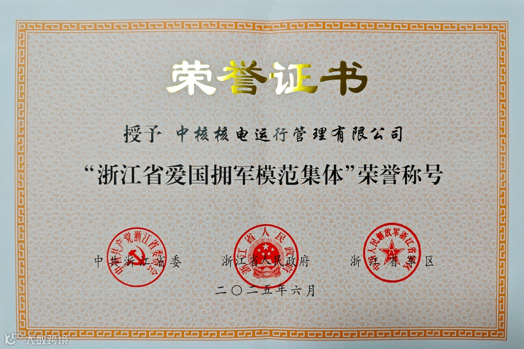 7月31日,浙江省退役军人工作暨双拥模范表彰大会在杭州举行,表彰了浙江省双拥模范集体和模范个人等。秦山核电荣获“浙江省爱国拥军模范集体”荣誉称号。秦山核电党委副书记周启航代表秦山核电接受表彰,并作为双拥模范集体代表上台领奖。该荣誉由中共浙江省委、浙江省人民政府、浙江省军区联合授予。