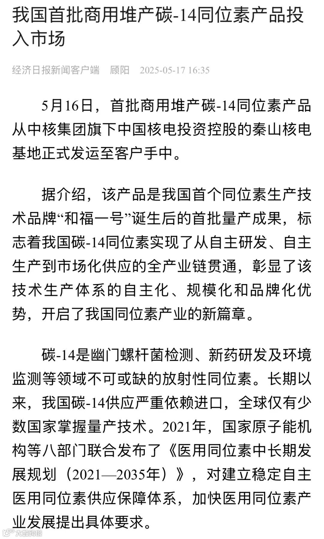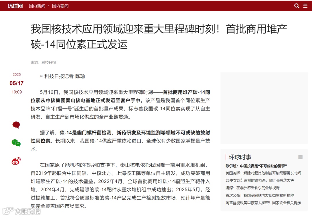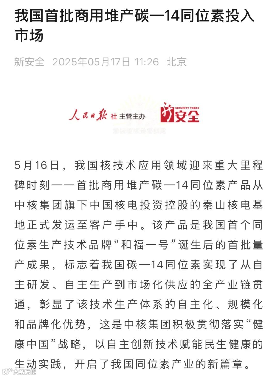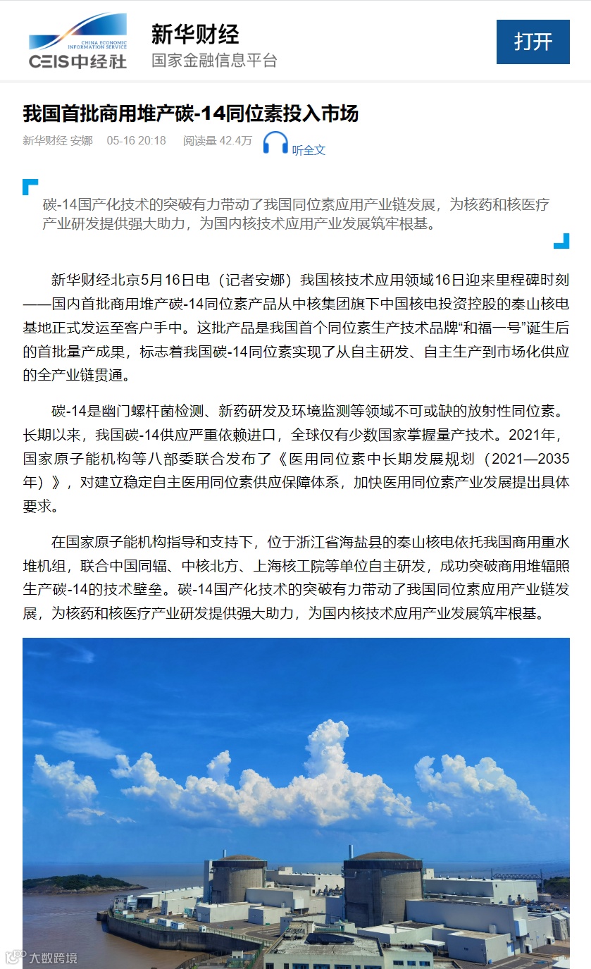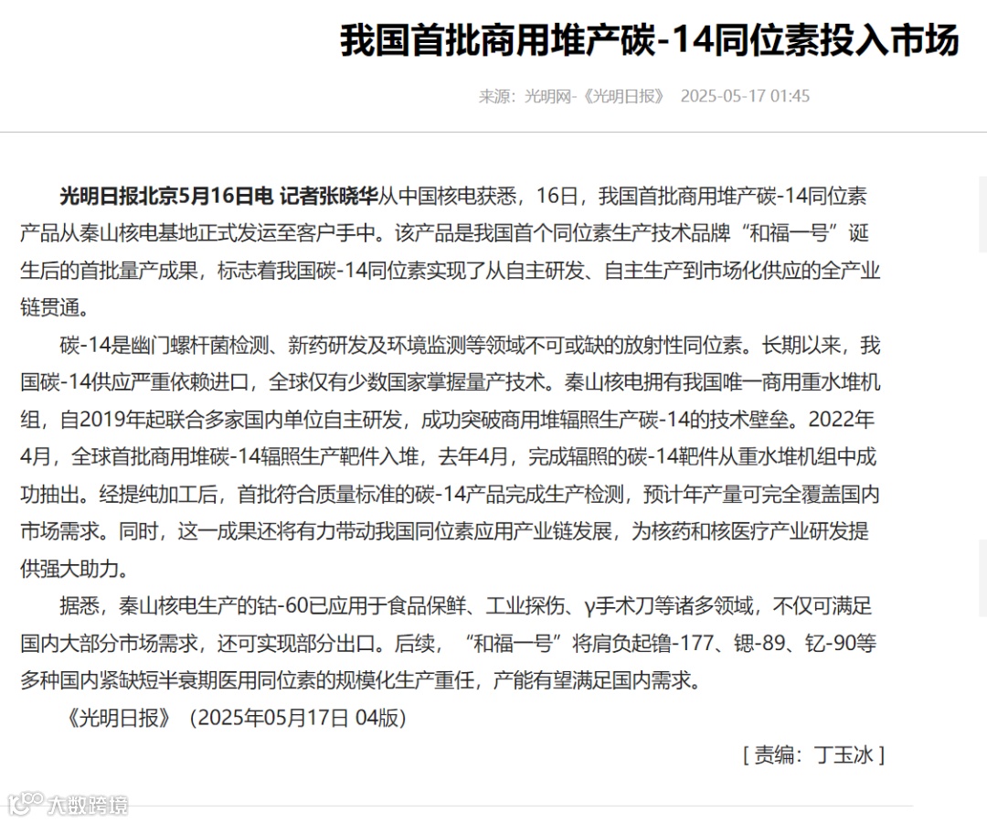 站在我国核技术应用的新起点上,秦山核电将始终以不负人民、敢于拼搏、敢于创新的精神和使命担当,持续发挥资源和技术优势,加快推进更多医用同位素国产化、批量化进程,在自主创新的征程上持续为“健康中国”建设贡献源源不断的“核动力”。