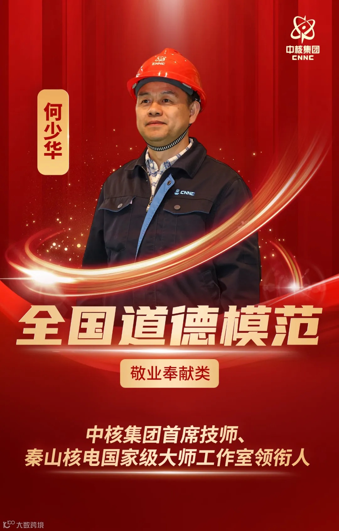 2025年5月23日,全国精神文明建设表彰大会在北京召开,60名(组)同志被授予第九届全国道德模范荣誉称号。其中中核集团首席技师何少华荣获第九届全国道德模范(敬业奉献类),成为我国核工业首位获此殊荣的员工,也是嘉兴市首位全国道德模范。