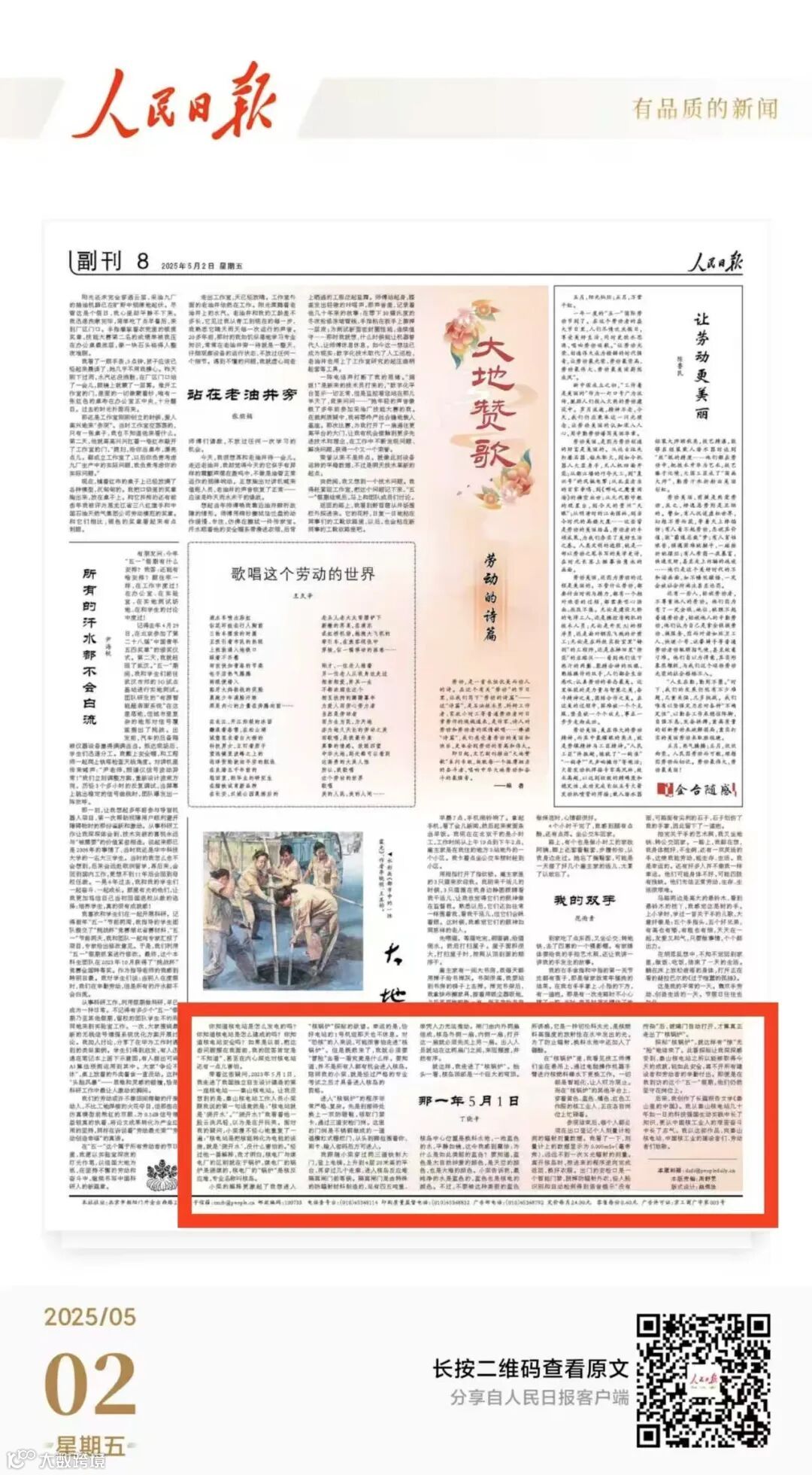 劳动,是一首永恒优美而动人的诗。《人民日报》文艺副刊推出“大地赞歌”系列专版,致敬每一个挺膺担当的奋斗者。今日,《人民日报》专版刊登了鲁迅文学奖得主、著名作家、《秦山里的中国》作者丁晓平2023年5月1日走进秦山核电站核岛厂房,感受核电工作者劳动之美、奉献之美的见闻。
