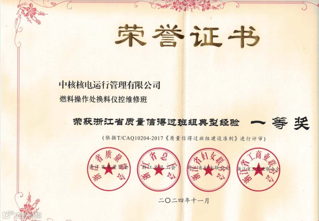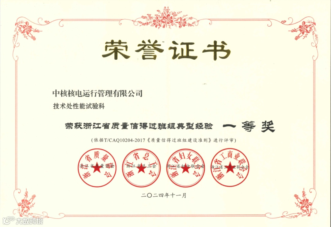 公司近年在质量信得过班组建设工作中取得可喜成绩。2024年公司质量信得过班组建设活动再创佳绩,荣获“全国质量信得过班组”2个、中核集团质量信得过班组大赛一等奖1个、浙江省质量信得过班组典型经验发布会一等奖6个。