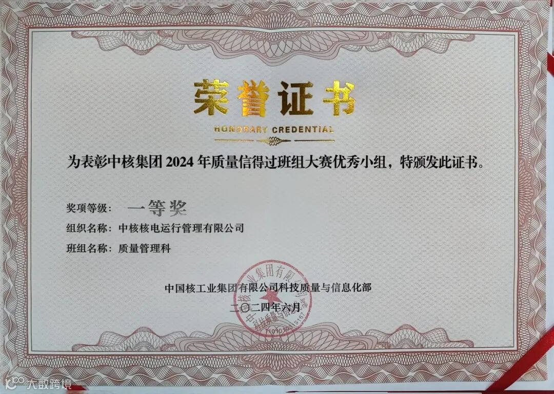 荣誉:全国质量信得过班组、中核集团质量信得过班组大赛一等奖;