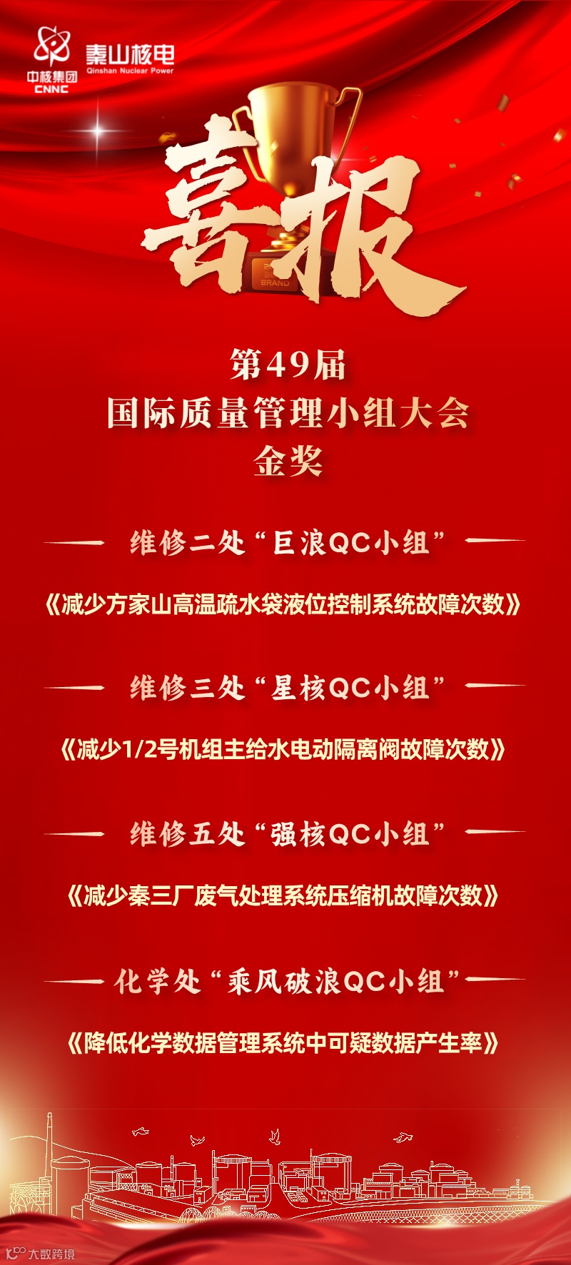 值得一提的是,秦山核电此次获奖的四个QC小组分别来自不同的业务领域,课题包括主给水流量调节系统、高温输水袋液位控制系统、废气处理系统及化学分析仪器应用。这些领域的质量改进与创新,生动展示了秦山核电在质量管理方面的全面性和专业性,也进一步为全球核电行业的质量管理树立了新的标杆。