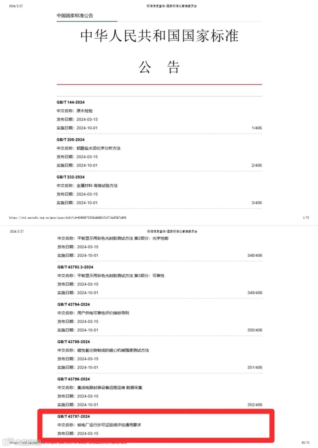 近日,国家市场监督管理总局、国家标准化管理委员会发布《中华人民共和国国家标准公告(2024年第1号)》,由秦山核电主导编制的第五项国家标准GB/T43797-2024《核电厂运行许可证延续评估通用要求》正式发布,秦山核电在标准化领域再添重要成果。