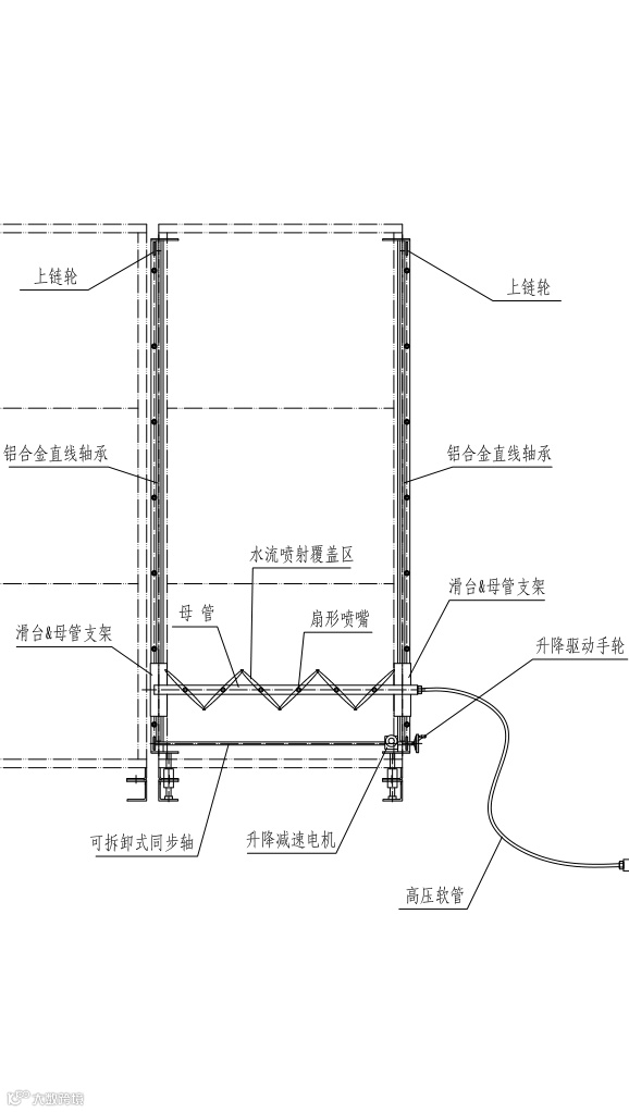 单从机械结构方面来说,项目组便历经了一年半时间的摸索。团队在初版方案的基础上优化设计了一种可挂靠且冲洗结束时可取下的带链条冲洗装置。然而,实际试验后发现,装置在链条间上下移动过程中,经常会出现不同步的现象,同时若水压较大,装置极易产生晃动,并不稳定。对此,项目组并没有气馁,再次推翻思路,重新进行设备结构的大胆创新,提出了使用更稳定的滑台结构代替链条结构的构想,并再次制作实物产品进行试验,最终取得了稳定、良好的冲洗效果。
