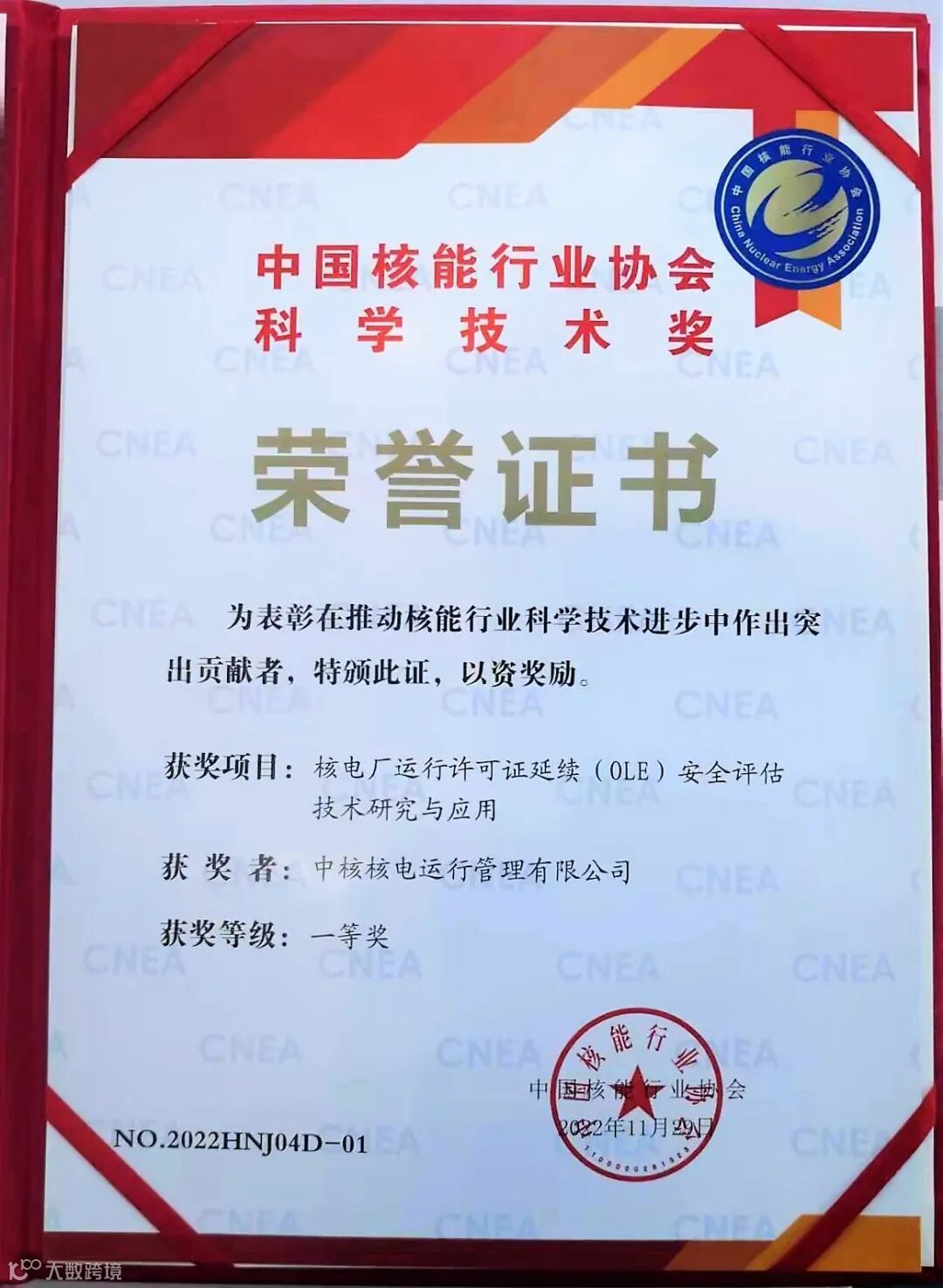 中国核能行业协会科技进步奖是为奖励在核能行业科学技术进步活动中做出贡献的单位和个人、促进核能科学技术发展而设置。秦山核电OLE项目成功解决了我国核电机组延续运行的瓶颈问题,填补了国内空白,首创了适用于我国的核电厂OLE技术体系和总体技术路线,掌握了核电机组长期运行的关键技术,形成了一整套自主可控的、完整的核电机组OLE安全评估方法、流程和标准化产品。这些成果不仅实现了我国核电厂OLE从技术准备到工程实施“零的突破”,谱写了“国之光荣”崭新篇章,对国内其他核电机组的OLE工作具有示范性和引领性,具有重大的经济效益与社会效益。