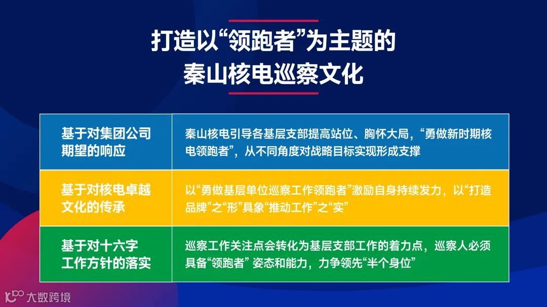 坚持品牌特色化,丰富内涵外延。秉持集团公司巡视巡察“同心、同向、同行”理念,公司党委全体巡察人以“领跑者”姿态扛起使命责任,引导各基层支部共同助力秦山核电“勇做新时代核电领跑者”。