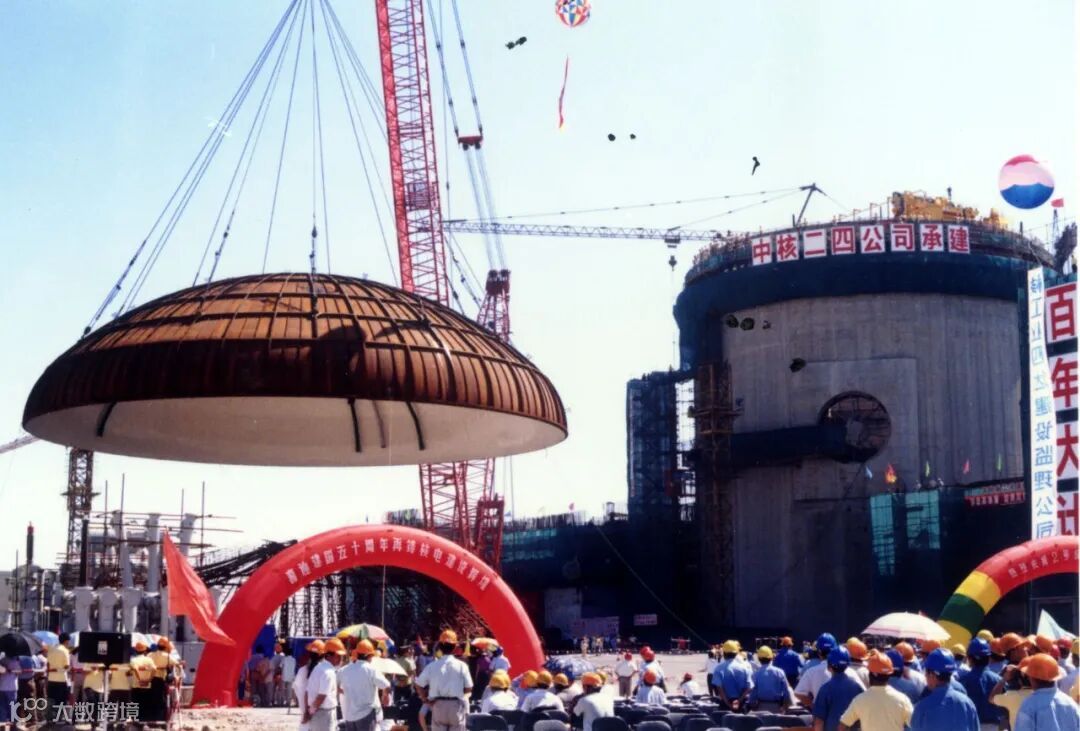 1999年9月14日,秦山二期核电工程2号机组反应堆厂房穹顶吊装成功。