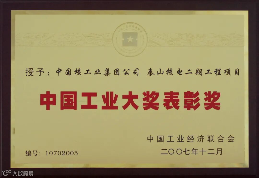 2007年12月26日,秦山核电二期工程项目荣膺中国工业大奖表彰奖。