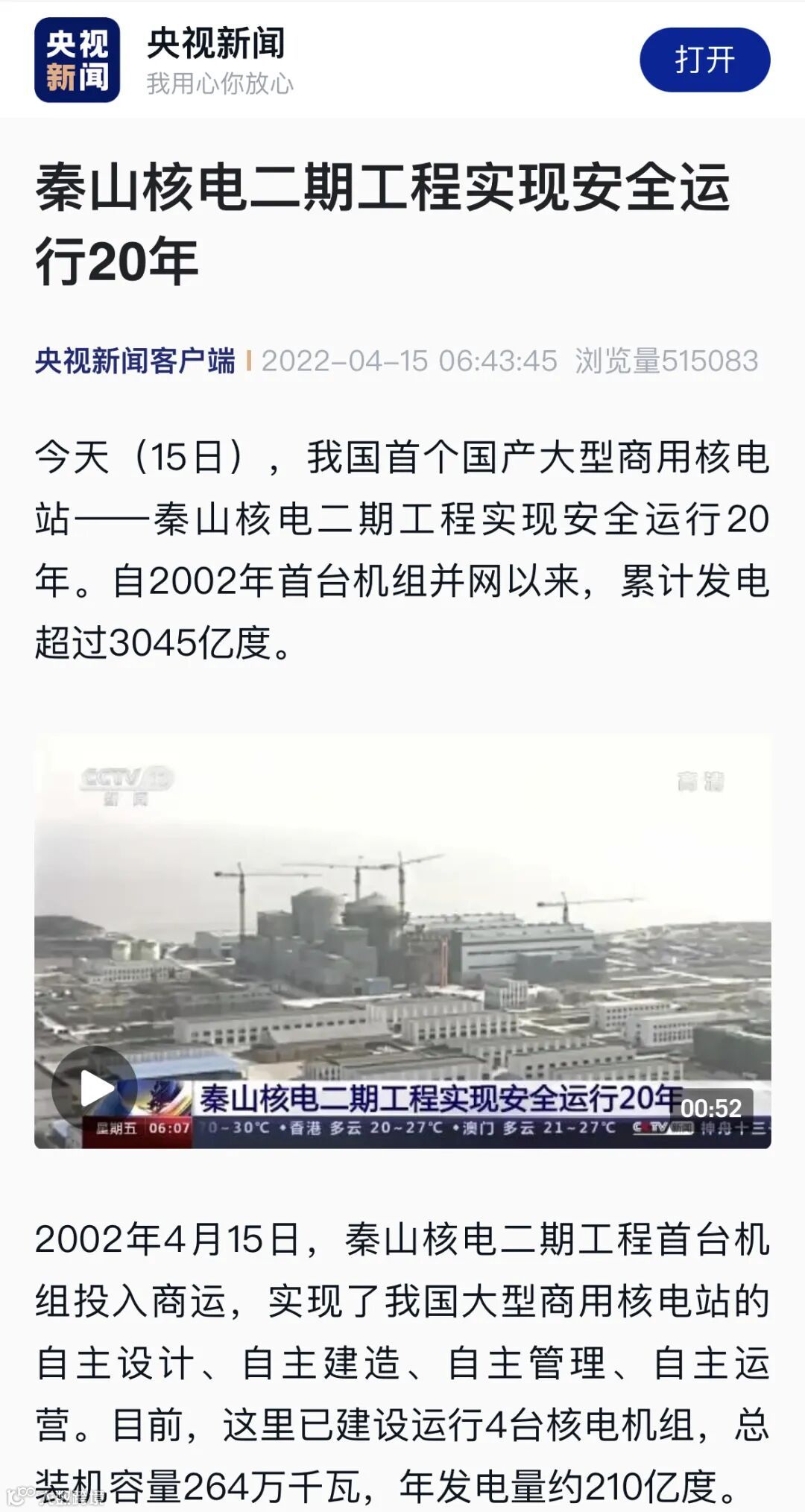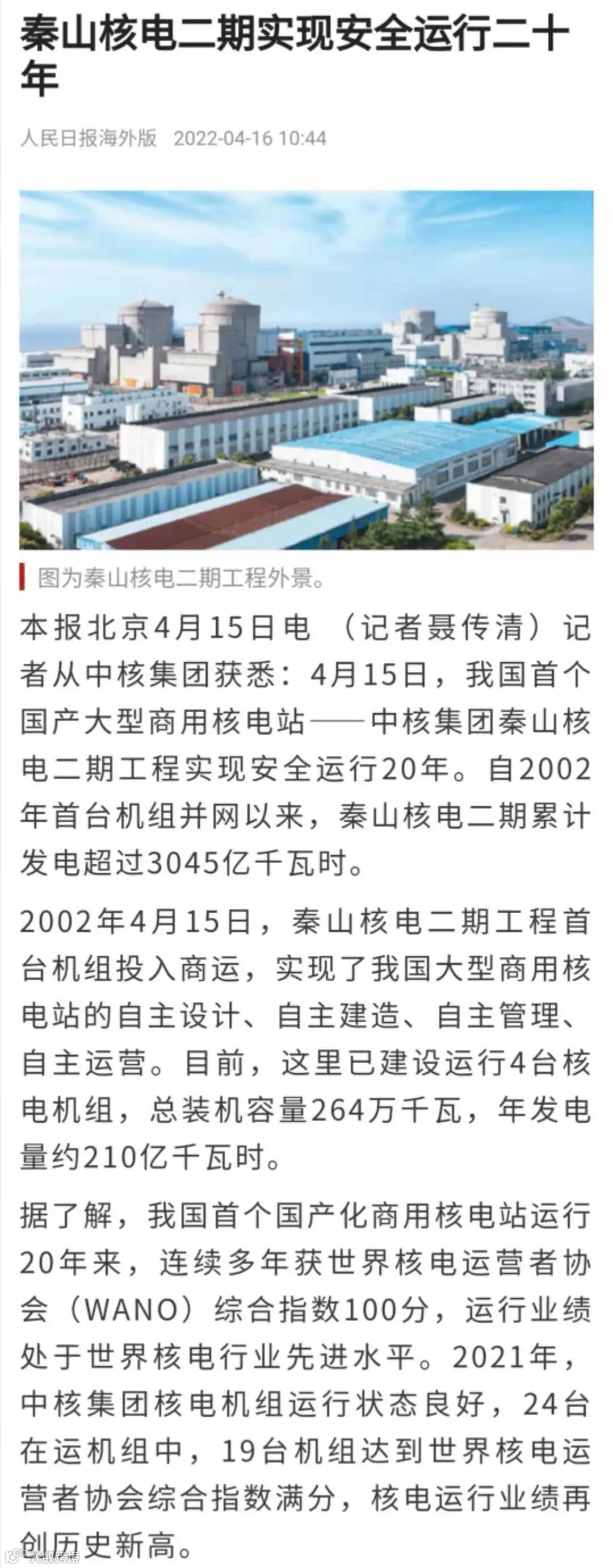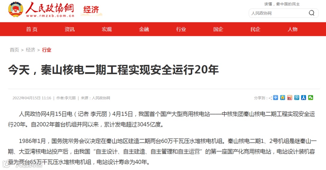4月15日,我国首个国产大型商用核电站——秦山核电二期工程实现安全运行20年。自2002年首台机组并网以来,累计发电超过3045亿度。