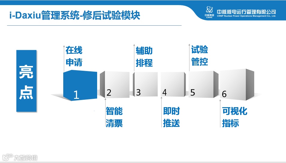 秦山核电针对修后试验实施过程中各部门的痛点,利用多年大修修后试验管理经验,开发了国内首个标准化、数字化的修后试验管理模块,具有修后试验在线申请、智能清票、辅助排程、即时推送、试验管控、可视化实时指标等功能。