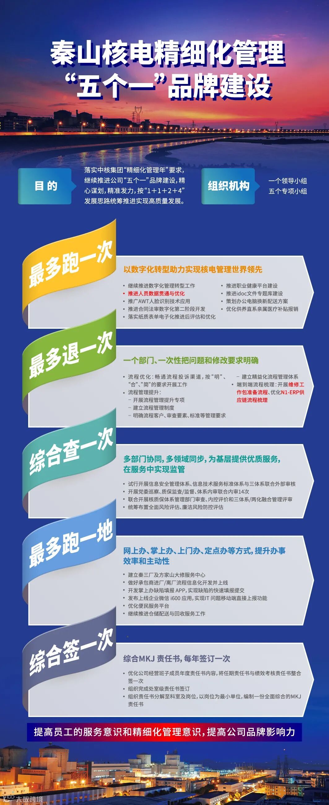 2022年是实施“十四五”规划的重要一年。在连续三年实践基础上,秦山核电将全面落实集团公司“精细化管理年”要求,持续推进“五个一”品牌建设,精心谋划,精准发力,踔厉奋发,按“1+1+2+4”发展思路统筹推进实现公司高质量发展。