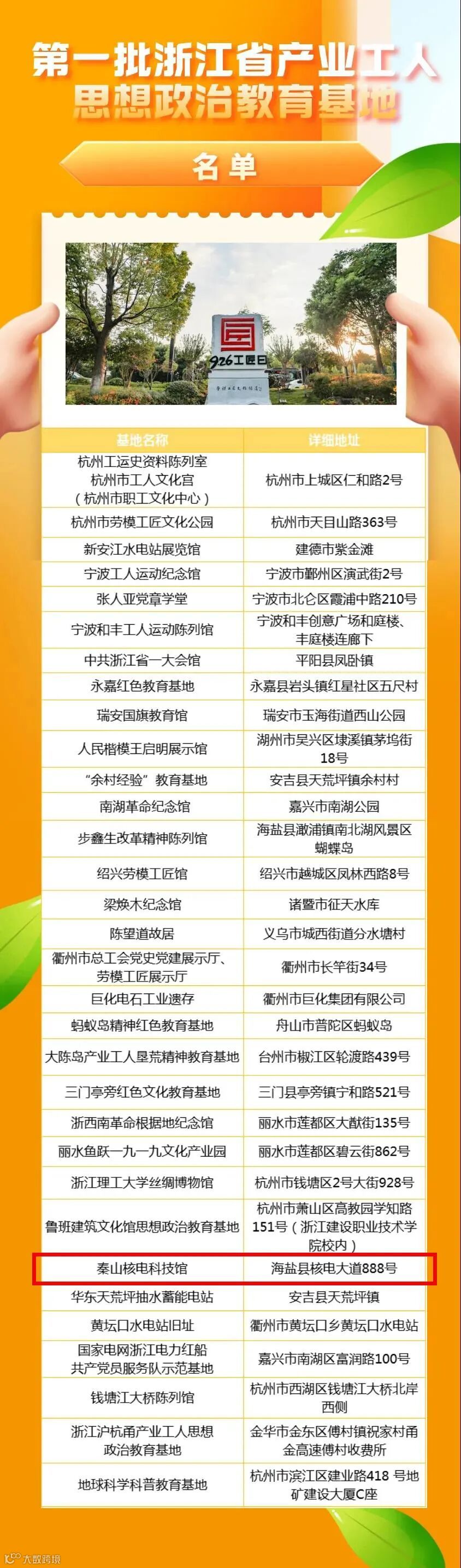 按照新时代产业工人队伍建设改革方案总体部署,为进一步加强和改进新时代产业工人队伍思想政治工作,经各市总工会、 省各产业工会申报,省总工会审核审定,确定“秦山核电科技馆”等32家单位为第一批浙江省产业工人思想政治教育基地。快跟着小编一起来看看吧~