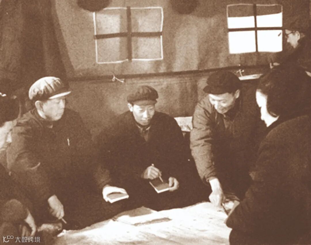 创业初期原公浦与科技人员在帐篷中进行科研攻关(左一拿笔和本者为原公浦)