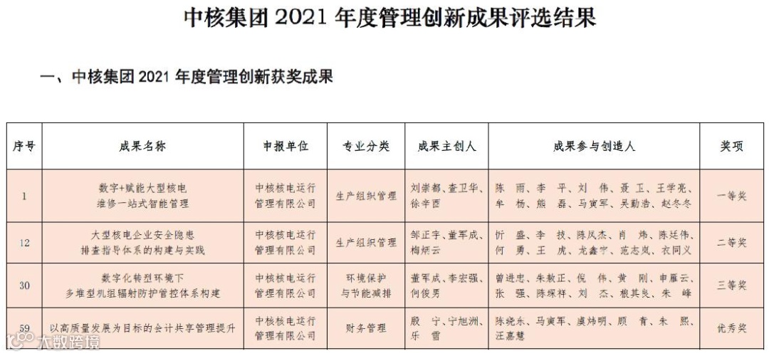 近日,在中核集团2021年度管理创新优秀成果评选中,秦山核电表现优异,四项成果获奖。