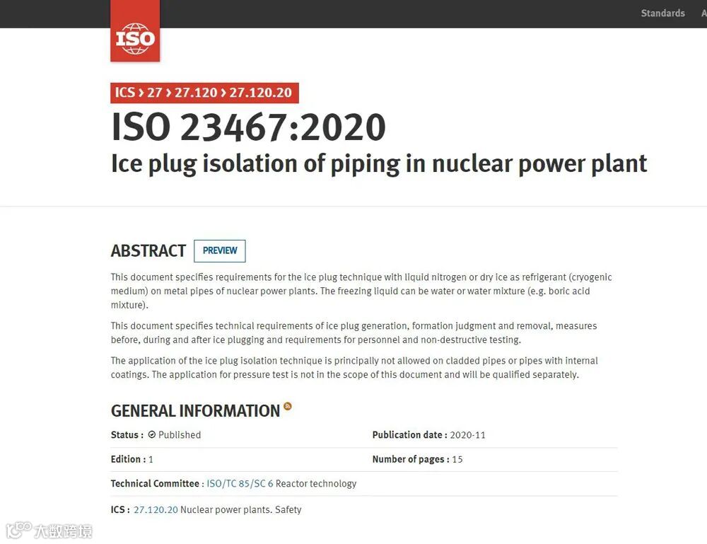12月1日,从国际标准化组织(ISO)中央秘书处得知,由秦山核电与中核战略规划研究总院核工业标准化研究所主导编制的ISO 23467:2020《核电厂冰塞冷冻隔离技术导则》正式发布。该标准是我国主导制定并成功发布的第二项核电领域国际标准,也是我国在ISO制定的第二项核能领域国际标准。