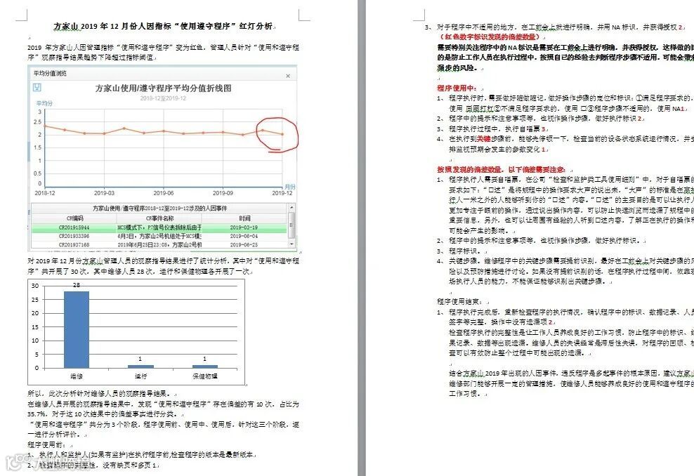 2019年12月份在进行人员行为指标监测时,系统自动报警,发现方家山生产单元的“使用和遵守程序”的人员行为指标出现异常。监测人员根据观察指导记录分析异常出现的事实,签发状态报告要求方家山单元制定纠正行动计划以改善这个弱项。