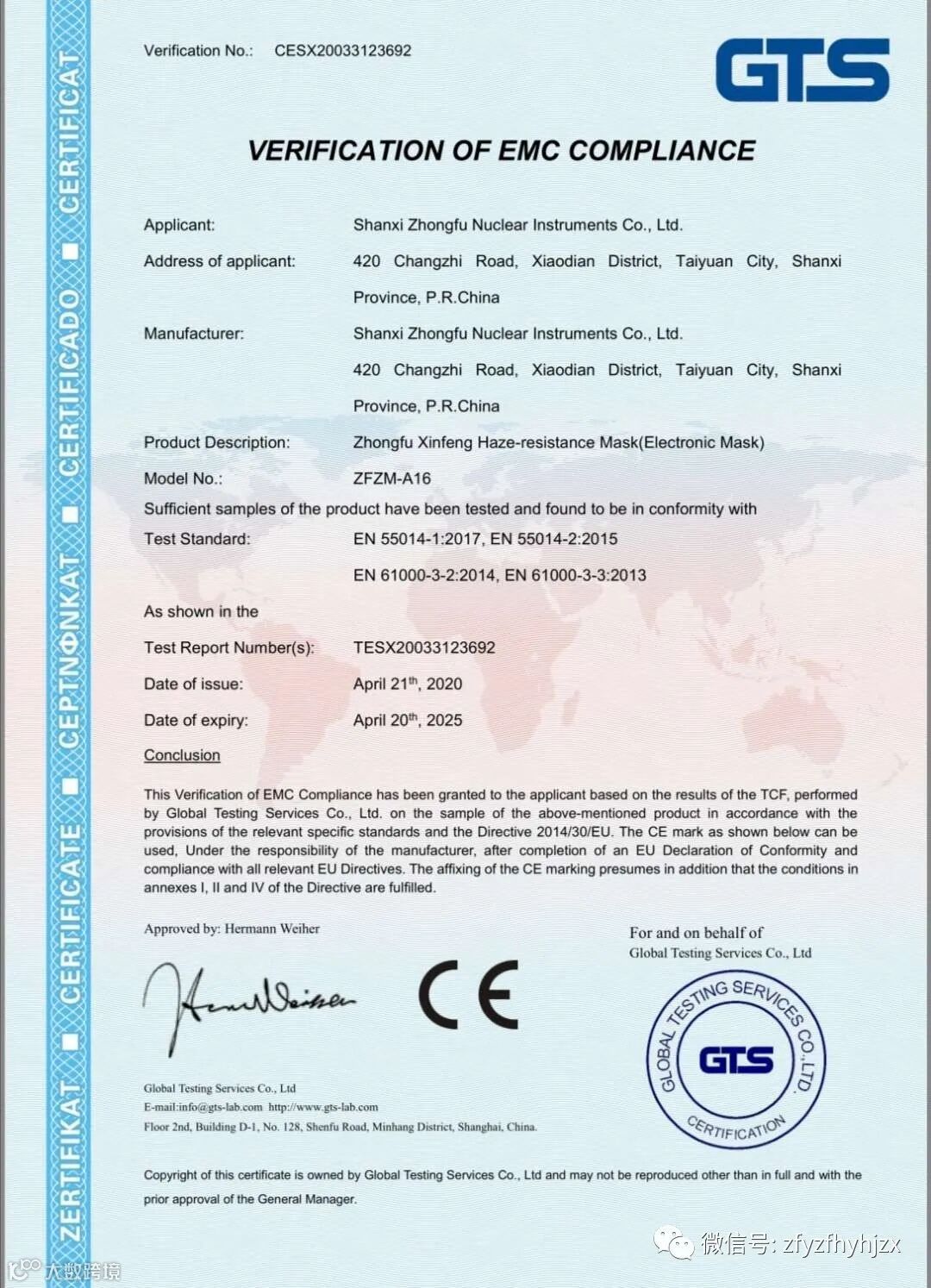 4月22日,中辐新风阻霾仪(电子口罩)正式通过欧盟国家强制性认证标准CE认证,标志着该产品及工艺达到世界级标准。